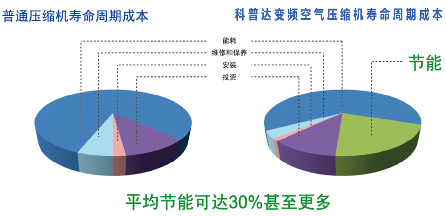 科普達(dá)變頻空氣壓縮機(jī)可跟蹤空氣需求量的變化自動(dòng)地調(diào)節(jié)電機(jī)轉(zhuǎn)速,平均節(jié)能可達(dá)30%甚至更多。投資科普達(dá)變頻空氣壓縮機(jī)的額外成本在1至2年內(nèi)即可收回。